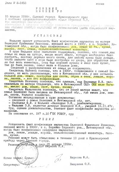 Франчишка Ивановна Белецкая с дочерьми: Зинаидой, Каролиной и Фридой в 1930г после раскулачивания были репрессированы и высланы в город Канск Красноярского края. Это был период, когда в СССР развивался тоталитарный режим. Под тоталитарным государством понимают такую форму государства, которая характеризуется полным (тотальным) контролем со стороны органов государственной власти над всеми сферами жизни общества, фактической ликвидацией конституционных прав и свобод. Сведений о раскулачивании семьи не сохранилось. Но на основании дела № 2-1453 (см. приложение), проживая, в селе Борейко Житомирской области во владении у них находилась земля, скот, инвентарь, пасека, кузня, большой дом и постройки. Все это имущество было конфисковано. Возникает вопрос: кто такой «кулак» и что такое раскулачивание. «Кулак» по Далю означает торгаш, сельский перекупщик, живущий обманом, обсчетом, обмером. После октября 1917года кулаками считали тех, кто использует труд наемных рабочих (Ю. Стецовский т.1 стр.40). Попадает ли семья под данные формулировки? Владели кузней. Но муж Франчишки Ивановны Федор Маркович сам был хорошим кузнецом, и сам работал на кузне. Инвентарь, лошади были необходимы для обработки земли. Напрашивается вывод: жить хорошо, добротно в те годы было нельзя. Почему?!