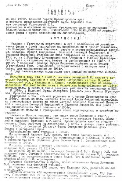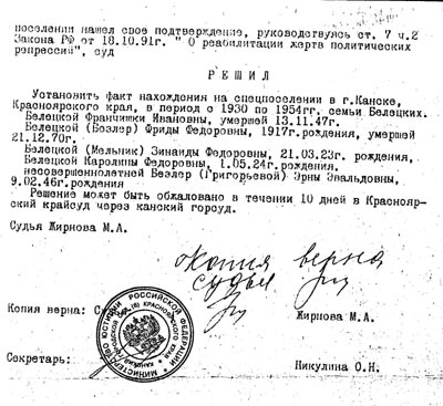 С 1930 по 1954г семья Белецких находилась на спецпоселении в городе Канске Красноярского края (приложение дело № 2-1603). Семья состояла из четырех человек: Франчишка Ивановна Белецкая и ее дочери Зинаида, Фрида и Каролина. Четвертая дочь Геня на поселение не попала, так как при раскулачивании отказалась, отреклась от своей семьи. Бабушка рассказывала о том, что в те времена некоторые люди специально так поступали, чем спасали себя и получали надежду на нормальное будущее. Но мне это трудно понять. Родные, близкие люди - это то, ради чего, кого нужно жить и что-то свершать. Почему кто-то ставит человека в рамки, когда ему приходиться делать такой страшный выбор, какой пришлось сделать Гене?