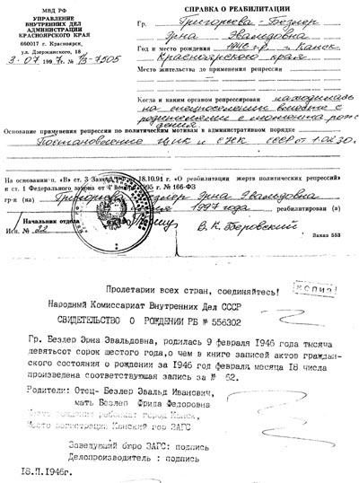 Моя бабушка Безлер-Григорьева Эрна Эвальдовна родилась 9 февраля 1946 года. Но