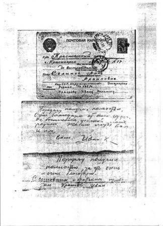 10. Почтовая карточка И.Н. Краснова А.А. Селиной с сообщением о получении