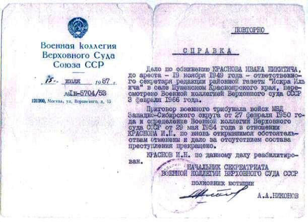 Шушенское пережило все события, которые происходили в нашей стране на протяжении 2-х последних веков. Первая половина двадцатого века была самой драматичной: революции 1917 года, следом гражданская война, коллективизация в 20-30-ые годы, после которой последовали массовые репрессии. Они коснулись многих семей шушенцев. Среди репрессированных оказался совсем молодой человек Краснов Иван Никитич, о котором пойдет речь в моей работе. Он не был героем, не совершал никаких подвигов, но через его жизнь прошла государственная машина, подавляющая личность. Иван Краснов после окончания средней школы в 1949 году начал трудовой путь ответственным секретарем в газете «Искра Ильича». На страницах газеты печатались его статьи, раскрывающие хозяйственную жизнь шушенских сельчан. Видя, непорядки, он критиковал упущения через хлесткие фельетоны. Через полгода своей трудовой деятельности он был арестован прямо на работе, провел шесть лет заключения в трудовом лагере Казахстана, испытав на себе тиранию власти. По всей вероятности этот период его биографии повлиял на его дальнейшую судьбу, что дало возможность его жене, Маргарите Дмитриевне Красновой, высказать свое мнение о нем: «Он был рядовым человеком... Работал в разных местах, на разных работах, на одном месте ему не жилось». (Письмо М. Д. Красновой к Татьяне Карпович от 27 декабря 2005г. , стр.21)
