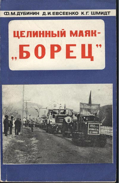«Борец». Так называется совхоз. И село тоже. Оно недалеко от знаменитого озера Шира. Если ехать по Енисейскому тракту на запад, то слева останется курорт, а там, дальше, за очередным узлом в просторной долине разом открывается панорама утопающего в зелени садов белокаменного поселка. Придорожный указатель направляет влево краткой надписью «Совхоз «Борец». И как только въезжаешь в поселок, встречает, будто приветствуя, установленный на высоком пьедестале трактор ДТ-54. Полусотней лошадей рванулся он вперед, в будущее, еще весной 1955 года и застыл вечным памятником тем, кто ставил в ковыльной, продуваемой всеми ветрами хакасской степи первые палатки, тянул первые борозды, собирал первый урожай, заводил первые отары...» [Дубинин Ф.М., Евсеенко Д.И., Шмидт К.Г. Целинный маяк—«Борец». Красноярское книжное издательство, 1983.]