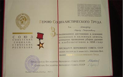 «1957 год. 21 января. Вручение ордена Ленина и золотой медали с присвоением звания «Герой Социалистического труда» директору совхоза Шмидту К.Г.