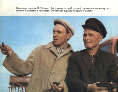 В совхозе созданы все необходимые условия (производственные, культурные, жилищно-бытовые) для высокопроизводительной и рентабельной работы коллектива...»,—подводит итог своей трудовой деятельности Карл Генрихович Шмидт.
