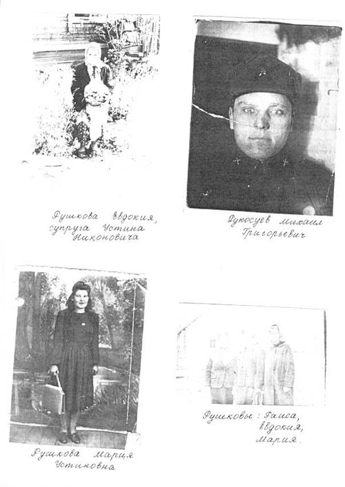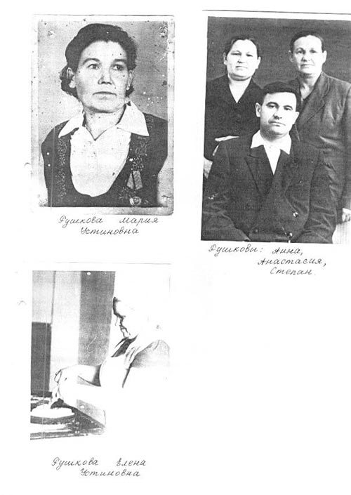 Рушковы, Устин Никонович, его вторая супруга Евдокия и их 4 детей: Елена, Ефросинья, Мария, Раиса жили в деревне Ганчиха Новосибирской области. Вместе с ними жили и дети от первого брака Устина Никоновича: Анисья, Анна, Настасья, Евдокия и Степан. Всего девять детей (см. приложение 13).Жили хорошо. У них был большой дом пятистенок, восемь дойных коров, было очень много молодняка, маслобойка, жнейка, веялка, лошади, мельница и т.д. Все дружно работали в своем хозяйстве. Маленькая Дуня, например, доила коров. «Пальцы замерзнут, в молоке отогрею и дальше доить»,- рассказывала она.