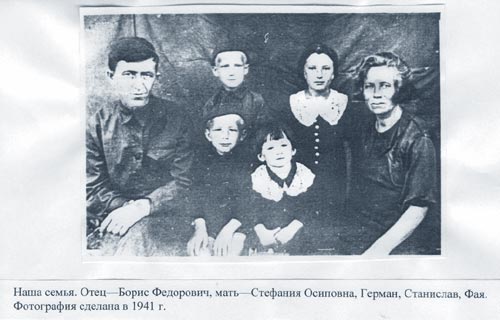 Борис подрос, основательно втянулся в работу. Он рано женился, стал самостоятельным, полноправным хозяином. Казалось, ничто не предвещало беды. Росли дети: я, Софья (мне было два года) и Герман, которому было несколько месяцев. Мои родители: Борис Федорович и Стефания Осиповна - жили дружно, в любви и согласии. Жили они тогда в Башкирской АССР Альшевском районе, станция Раевка, на хуторе.