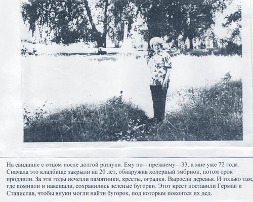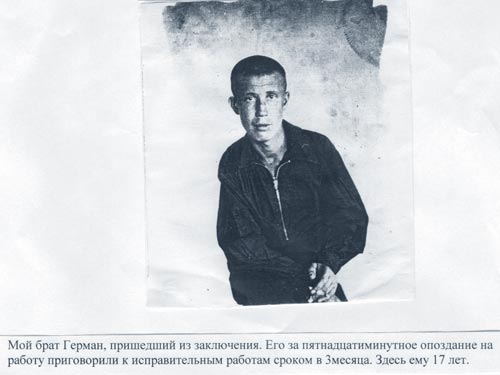 «Когда моему брату Герману было 17 лет, он опоздал на работу на 15 минут и по указу от 26 июня 1946 года был осужден на три месяца исправительных работ. Для нас это было новое потрясение… Только здесь, в Подтесово, я задумалась над тем, что город Анжеро–Судженск заселен переселенцами (репрессированными): там были 1, 2, 3, 4 колонии. Были Анжерка и Судженка, впоследствии объединенные в один город. Из детства с горечью вспоминаю время, когда пошла в 5 класс. Нас оскорбляли сибулонцами (переселенцами), бросали в нас камнями, кочерыжками, крича: «Бей сибулонцев!» Научилась защищаться. Интересно: сейчас помогают малоимущим, а в войну у мамы была мизерная пенсия в 240 рублей на четверых детей и огромные продовольственные налоги на яйца, молоко, шкуры, мясо и т.д. Все надо было купить: уголь, дрова, одежду, продукты, книги, заплатить налог за строение. Нам никто не помогал – справлялись сами».