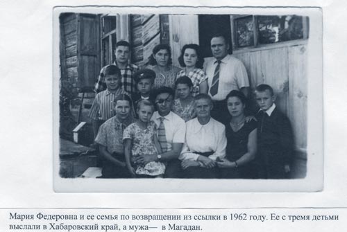 Софья Борисовна продолжает: «Самое страшное, что выселяли семьи, разлучая родных. Тетю Маню отправили с тремя детьми в Хабаровский край, а ее мужа в Магадан. Не сразу она смогла уехать к мужу. Из Магадана по окончании срока они переехали жить в Алтайский край, это произошло в 1962 году.