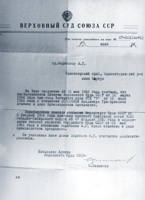 Из Главного управления внутренних дел Красноярского края мы получили архивную справку. Из этого обращения стало известно, что все дела до сих пор хранятся в РУ ФСБ РФ по Красноярскому краю. И все что описывает Владимир Григорьевич в своей рукописи абсолютная правда, все подтверждается архивными документами и выписками.