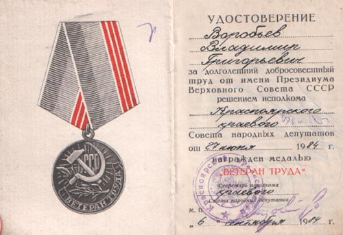На основании Указа Президиума Верховного Совета СССР от 18 января 1974 года и Указом Президиума Верховного Совета СССР от 12 августа 1983 года «О внесении изменений и дополнений в некоторые законодательные акты СССР» исполнительный комитет краевого Совета народных депутатов решил: от имени Президиума Верховного Совета СССР за долговечный, добросовестный труд наградить медалью «Ветеран труда», по Краснотуранскому району, Воробьёва Владимира Григорьевича