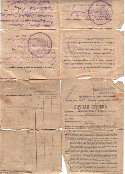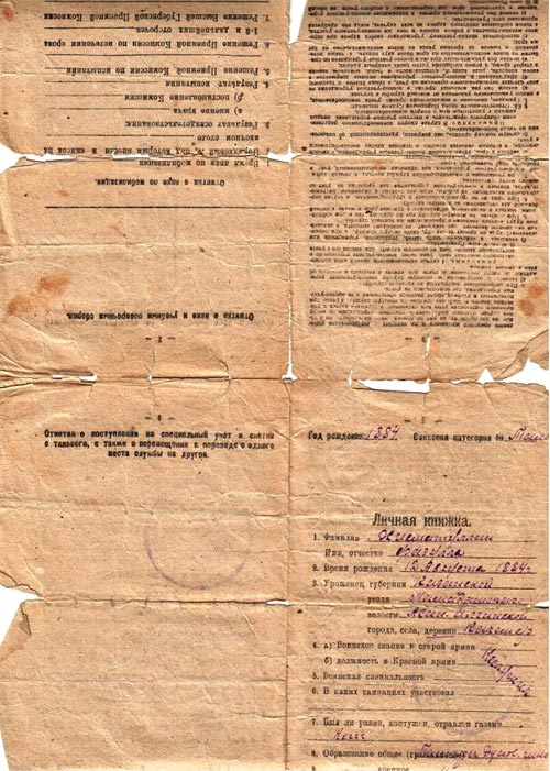 Когда началась война, его оставили в городе Красноярск, потому что он был сыном врага народа, на фронт не пустили. Определили в трудармию в городе Красноярск. Отправили на кирпичный завод №2. Он рассказывал, что рядом с заводом находился хлебозавод. Работа на кирпичном заводе была тяжелая, не все выдерживали. Работники хлебозавода жалели их и кидали им через забор хлеб. В казарме есть «не положено» было. Приходилось прятать в туалете, делить и есть в цеху.