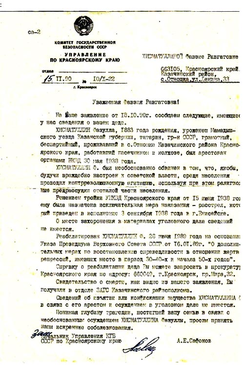 Внучка Хисматулина Фаузия Равгатовна хотела узнать место захоронения дедушки Хисматуллина Фазуллы и поэтому написала в Управление по Красноярскому краю. Ей пришел такой ответ: