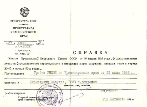 Через 30 лет семья Хисматуллиных узнала из новостей по радио и из газет «О дополнительных мерах по восстановлению справедливости в отношении жертв репрессий, имевших место в период 30-40 и начала 50-х годов» и вновь попытались что-то узнать о своем дедушке. Они получили справку из прокуратуры Красноярского края от 27 июня 1989 года о его реабилитации.