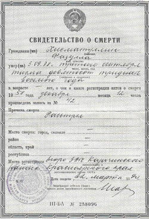 В 1990 году Хисматуллина Фазуллы, Хисматуллина Фавзия, обратилась в Казачинский ЗАГС и получила повторное свидетельство о смерти своего деда. Причиной смерти было указано – расстрел и дата смерти 3 сентября 1938 года.