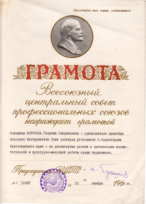 За долгое время работы в оркестре было заработано много различных наград: городского, областного, краевого и всесоюзного уровней. Их действительно настолько много, что если каждую поместить в рамку, и повесить на стену размером 2х4, они полностью закрою её. Две представленные грамоты одни из наиболее дорогих для Георгия Гавриловича.