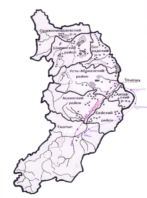 Но ребятам, которые учились всего в 6-7-х классах, удалось одолеть сложнейший маршрут без потерь и серьезных проблем. А путь был достаточно непростой. Судите сами: начальная точка располагалась в Таштыпе. А до Таштыпа участники похода доехали на машине.(на карте красная линия) Группа двинулась в сторону притока Абакана Оны, затем на Абазу, вдоль реки Абакан до Арбаты, через Джойские пороги вышли к Майна, затем Шушенское, далее через Минусинск к себе домой в Черногорск.
