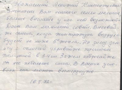«В 1936 году меня Леонов Иван Матвеевич, через письмо, пригласил на курсы. Хотя я уже владел правилами ухода, но он был селекционером по деревьям, а жена его по ягодным кустарникам. Но и нас садоводов многих увлёк на селекционную работу, выводить новые сорта, особенно яблонь...