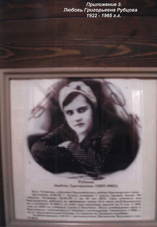 Обратимся к биографии Любови Григорьевны Рубцовой. Сведения очень скудны. Так по официальной версии, она родилась 4.10.1922г., «русская, уроженка с. Дрокино Емельяновского района Красноярского края. Ученица 7 класса школы №4 г. Канска. Вместе с ней арестованы ученики: Зинина Анна Александровна, 1923 г.р., и Уфаев Николай Владимирович, 1920 г.р. Причина ареста: составление и распространение листовок контрреволюционного содержания, распространение их в предпраздничный день. Арестована по доносу матери, Дарьи Дмитриевны Рубцовой, которая при уборке комнаты обнаружила под матрацем у дочери листовки, отнесла их в Канское РО НКВД. 20.05.1939 ВС Красноярского крайсуда по ст.58.10 ч. 1, 58-11 УК осуждена на 10 лет ИТЛ+5 п/п. 20.08.1939г. Судебная коллегия по уголовным делам ВС РСФСР приговор оставила в силе, убрав 5п/п. Отбывала в Абанской сельхозколонии. 19.09.1939 совершила побег с Шиманским Валентином Андреевичем. Задержаны через 2 дня, доставлены в колонию. 30.09.1939г. нарсуд Абанского по ст. 82 ч.1 УК осуждена на 1,5 года + оставшийся срок наказания. Отбывала в УИТЛ завода п/я 169 (Красноярск), работала каменщиком. 21.05.1948 направлена в Озерлаг. По отбытии срока отправлена на поселение в Богучаны с 15.10.1949. Болела. Переведена 2.08.1950, благодаря хлопотам матери в с. Устьянск Абанского района (приложение №5). В январе 1955 переведена в г.Канск. 29.10.1955г. освобождена»