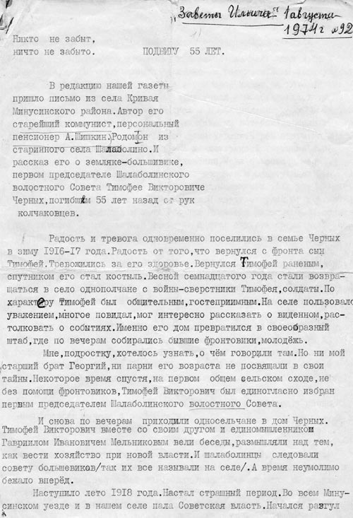 За 25 лет существования нашего краеведческого объединения мы разрабатывали эту тему в 1985, в 2000, 2007 годах. За это время в нашем школьном архиве накопилось много материала: это документы из архивов Курагино, Минусинска, Красноярска, Москвы. Мы вели переписку с Шушенским музеем – заповедником, музеем имени Мартьянова г. Минусинска, с партархивами, учеными Красноярского государственного педагогического университета. Много накопилось фотографий, вырезок из газет и журналов, интервью с жителями села.