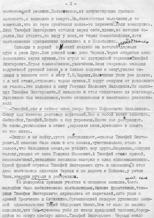 Был арестован председатель Совета Черных Тимофей Викторович, Завёрткин Дмитрий Ионнакиевич. Вот что пишет Дмитрий Ионнакиевич в своём письме краеведам: «Нас схватили и повели к сельскому совету. Собрались шалаболинские кулаки. Это были Подольский, Шлёмов, Исайка Колмаков. Окружили нас, и давай бить по головам, приговаривая: «Вот вам, совдепщики». У нас сбили фуражки с головы. В этот момент влетает в толпу казак (из письма Черных Петра Викторовича мы выяснили, что это был Мельников Егор Сафоныч, дядя Тимофея Викторовича, воевавший на стороне белых), и со словами: «А ну, разойдись», вырвал нас из толпы и повел в сельский Совет. Оставил нас там при открытых дверях и ушел. Мы осмотрелись и через зады удрали» Но позже Черных арестовали и повели в Пойлово, ненависть к нему была настолько сильна, что по дороге его пытали, и поэтому не довели до села, и 18 июня 1918 года расстреляли у речки Чимы. Стреляли в затылок. Когда об этом сообщили родственникам, то мать Тимофея и дядя поехали за ним, привезли на телеге. Его запретили хоронить на кладбище, но всё-таки удалось договориться, чтобы похоронить на кладбище. Хоть это было небезопасно, провожало его много людей. Плач стоял над селом. Его любили в селе. (5. ф 1, о 1, д 12)