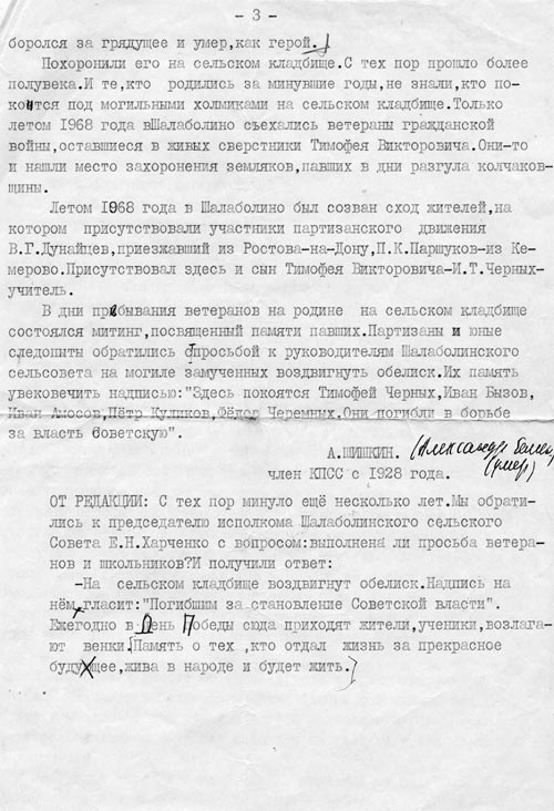 В первую же ночь в Шалаболинском бору были расстреляны Черемных, Куликов Петр, Амосов Иван. Их похоронили за оградой кладбища, и местным жителям запрещено было провожать их до кладбища. Новая власть за этим проследила.