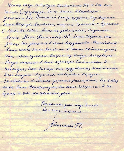 Сын партизана Семена Песиголовца в письме краеведам пишет: «Центром связи с партизанами была наша квартира. У нас же был потайной склад оружия, под парниками, в огороде: винтовки, патроны, гранаты и пулемет. Мать была связная. Она знала, что делается в селах, в окружности Шалаболино. Наша семья была включена в список неблагонадежных. Мать выкрала у офицера из банды Сотникова леворверт, когда они мылись в бане. Мне было сказано подготовить отверстие в грядах. Когда схватились леворверта, все в квартире перевернули. Мать несколько раз ставили к стенке, но она говорила: «Я не брала, это не женское дело». К приходу армии Щетинкина-Кравченко организация насчитывала около 70 человек. Она имела достаточно оружия и патронов.(5. ф 1. о 1. д 25, 27)