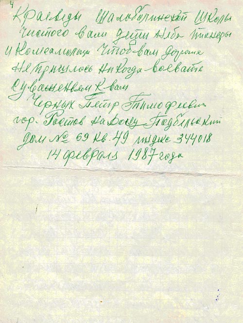Письмо Черных Петра Тимофеевича от 14.02.87 года, адресованное Андрееву Петру