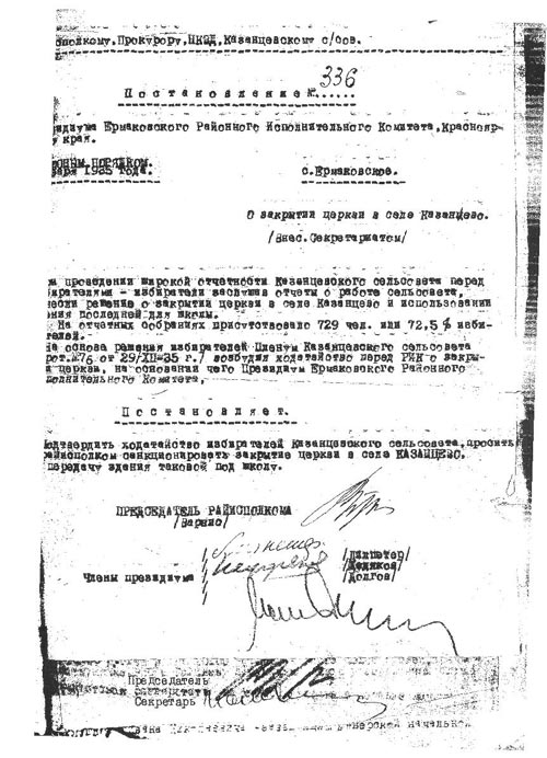 Наша церковь была закрыта на основании решения общего схода односельчан, который проходил в декабре 1935 года. Документ говорит о том, что на собрании присутствовало 729 человек, что это решение было общим.(5) Однако у нас это вызывает большое сомнение. Вряд ли нашлось в селе помещение, чтобы вместить такую массу людей. Собрание проходило под Новый год, в конце декабря, скорее всего, в мороз. Напрашивается мысль о насильственном сборе людей на улице. А что решишь в таких условиях? Только то, что хочет услышать начальство, да желание поскорее разойтись по домам. Но, судя по воспоминаниям старожилов, далеко не все казанцевцы хотели закрытия церкви. Откуда же это единение в декабре 1935 года? Никто таким вопросом тогда не озадачивался. Просто решение сельского схода утвердил райисполком, а решения последнего утвердил крайисполком 16 января 1936 года, и дело было сделано. (6)