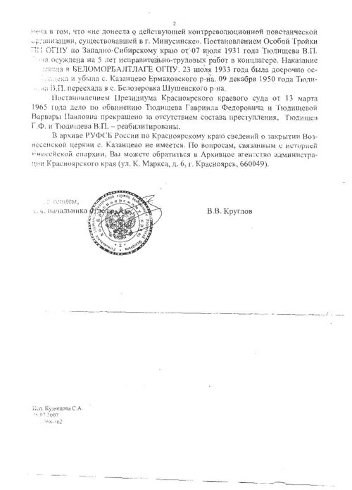 Арестован Гавриил Федорович был 14 февраля 1931 года за то, что якобы «создал на территории бывшего Минусинского округа контрреволюционную организацию, целью которой было свержение советской власти». Судила его Особая Тройка ПП ОГПУ по Западно-Сибирскому краю 7 июля 1931 года, приговорив к высшей мере наказания. Расстрелян Гавриил Федорович был 20 июля 1931 года в г. Минусинске.(7) Казанцевская церковь Вознесения была закрыта 16 января 1936 года. Это мы установили совершенно точно, благодаря найденному в Ермаковском архиве постановлению о закрытии церкви в селе Казанцево, и присланной Архивным Агентством Красноярского края копии постановления президиума Крайисполкома, разрешающим закрытие нашей церкви. (5, 6)