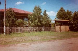 Вплотную друг к другу шли амбары, завозня, погреб-ледник, конюшня и хлев для скота – всё под одну крышу. Высокий забор из полубрёвен, уложенных в паз, высокие с навесом ворота, рядом с воротами - глухая калитка в ограду, широкое крыльцо в улицу у лавки, палисад под окнами жилой части дома, много цветов. Небольшой огород для мелочи. На противоположной стороне спуска к реке, вне ограды - баня и бойня для скота. Такими же были и другие богатые усадьбы в деревне.
