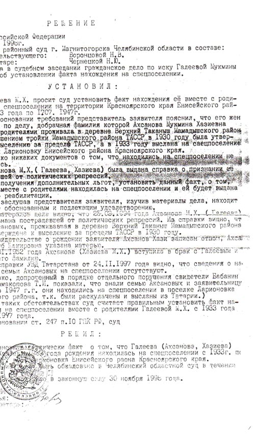 Но зимой 1930-го года это его не спасло и его семью раскулачили из- за добротного кирпичного дома и зато, что он держал много скотины. Дом этот до сих пор стоит в Татарстане в деревне Таканеш. Семью сначала выселили в баню, затем погрузили в товарный вагон и отправили в Сибирь. Напомню, что это было зимой, в вагоне было холодно, а моей бабушке Мукмине был всего лишь годик, когда она вместе с тысячами несчастных ехала в этом ужасном вагоне. Первыми заболели дети, потом появились умершие. На станциях забирали трупы и на вагон давали только ведро воды. В Красноярске умер самый младший сын- Хамит. Прадед ночью забрал его из подвала, который был заполнен детскими трупами и похоронил его где- то рядом с бараком.