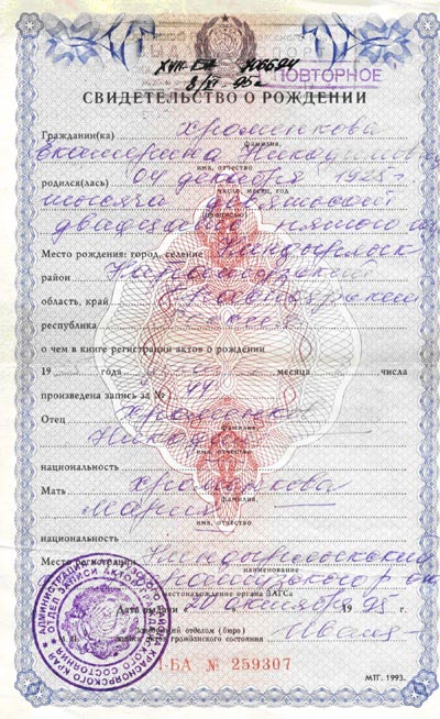 Она вернулась к матери в Артемовск, начала работать в местной школе, где и получила свой первый в жизни документ. Из Артемовска они переехали в Усть-Абакан.