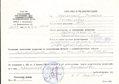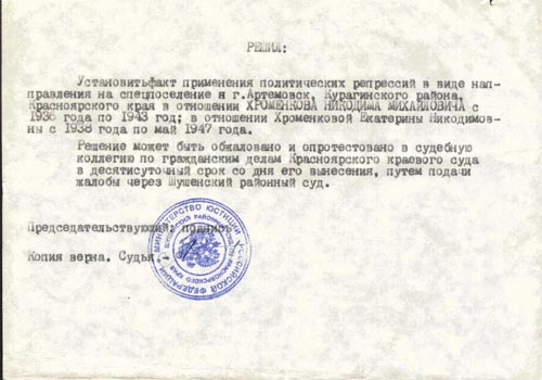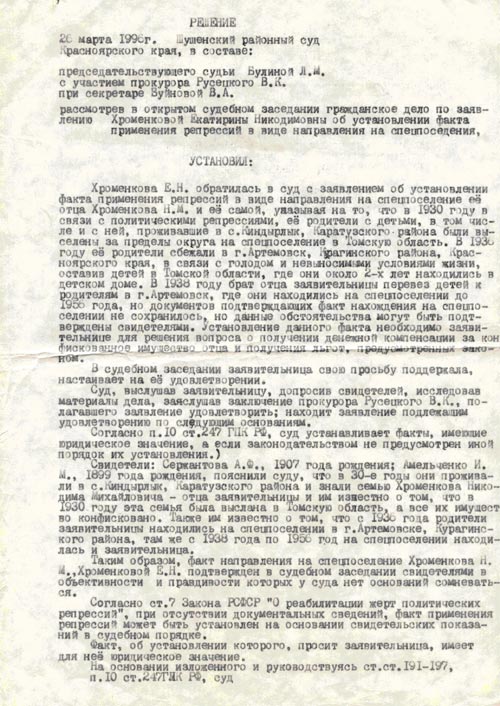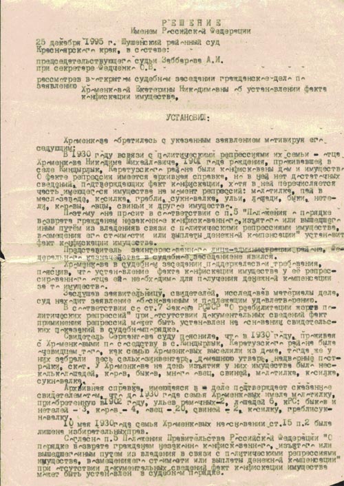 Осудила нас «тройка» (См. приложение 8). Меня отправили на 3-е отделение будущего совхоза Ленина, туда, где Алтан, Шушенского района. Шли мы туда пешком. Нас такая городьба была! Просто как стадо овечек всех загнали и все. Вот мы там строили базу, на покос ходили. Потом, через 4 месяца меня освободили» (Из личных воспоминаний Екатерины Никодимовны Хроменковой.)