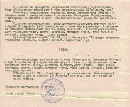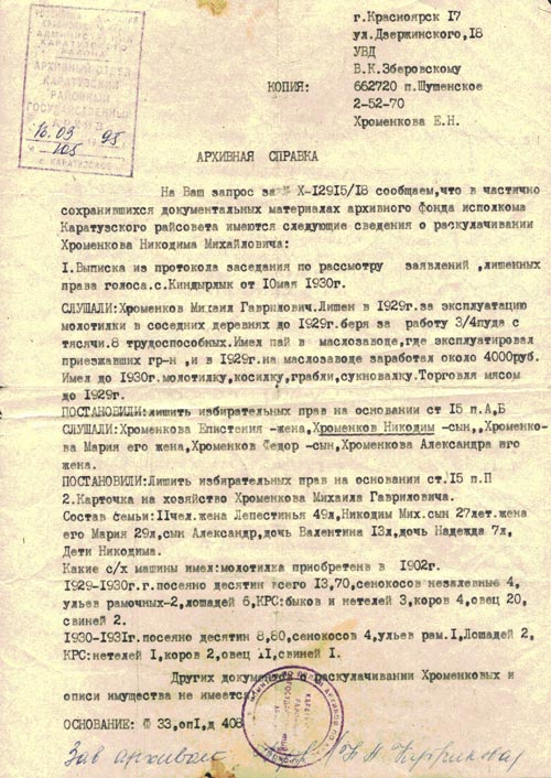 Все имущество, в том числе и дом, конфисковали (См. приложения 3.1; 3.2; 4; 5; 6 ). А ведь сельхозинвентарь, которым обладала семья Хроменковых: молотилка, косилка, сукновалка, ульи – и скот: быки, коровы, овцы, свиньи – по сути и являлись основным средством для выживания многочисленной семьи. К тому же 10 мая 1930 года на основании статьи 15 пункта 2 семья Хроменковых была лишена избирательных прав.