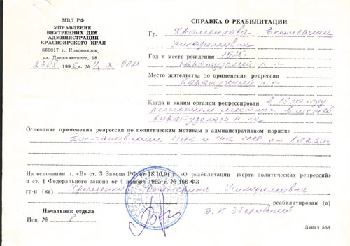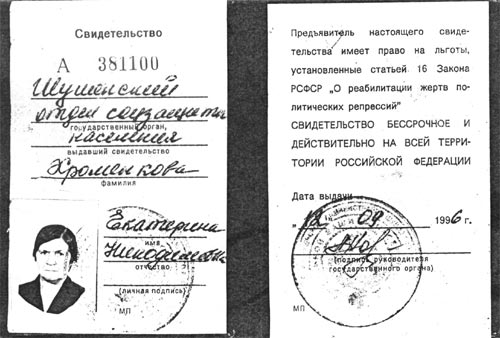 Когда Екатерина Никодимовна вышла из лагеря, то на руках у нее не оказалось никаких документов. К сожалению, нет никаких фотографий, да и какие фотографии? кто бы осмелился сохранить фотографии…