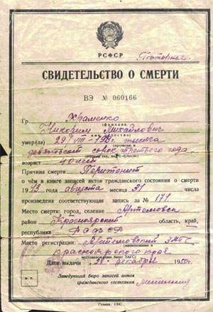 В 1943 году умер отец Екатерины Никодимовны, но не на войне (в Советскую армию спецпереселенцев не принимали), а от перитонита. (См. приложение 8)