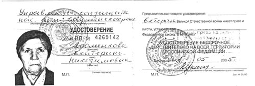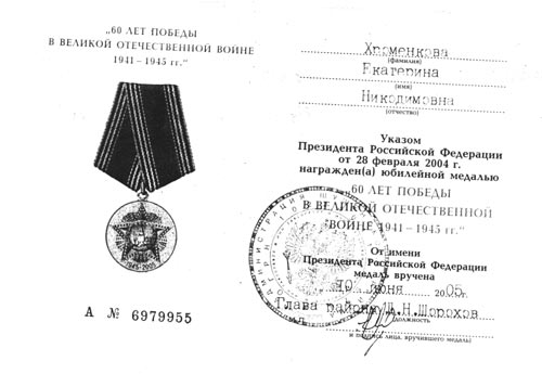 10 июня 2005 года Екатерина Никодимовна была удостоена юбилейной медали к 60-летию победы в Великой Отечественной войне. (См. приложения 13, 14)