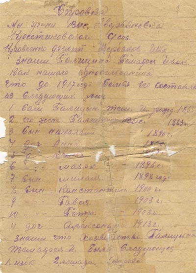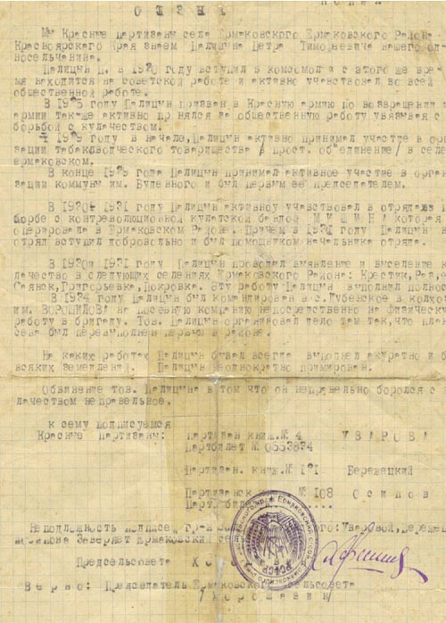 Мой прадедушка, Палицын Петр Тимофеевич, родился 18 июня 1903г. в с. Ермаковское, Ермаковской волости, Минусинского уезда, Енисейской губернии. Как свидетельствует справка крестиковского с/совета Ермаковского района от 1916г., у Палицына П.Т., кроме родителей (отца- Палицына Т.И. -1865г.р., матери- Палицыной В.П.-1863г.р.), было 9детей. Из этой же справки следует, что хозяйство Палицына Т.И. было следующее:1 изба,2 лошади,1 корова,4 га посевной земли. Социальное положение - бедное.