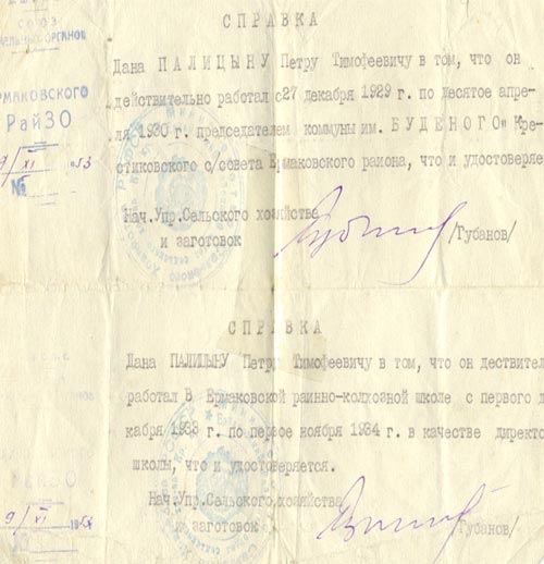 Перебирая документальный архив моего прадеда, рассматривая его фотографии, слушая рассказы-воспоминания о нем наших односельчан, все больше убеждаюсь в мысли о том, какой же это был необыкновенный человек, хороший организатор, великий хозяйственник, отличный режиссер, одним словом, незаурядная личность. За свои трудовые заслуги Палицын Петр Тимофеевич был награжден почетной грамотой.