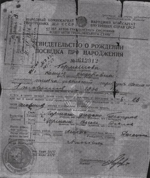 Отец – Федор Петрович, работал в колхозе трактористом, мать – Василиса Павловна – дояркой. (Прил.7) В семье уже росли две дочери: Любовь и Клавдия, позже родилась дочь Раиса, затем сын Леонид. Перед войной, в 40 – м году родилась младшая – Галина. В домашнем архиве сохранилось свидетельство о рождении бабушки. Пожелтевшее от времени, протершееся на складках, оно выдано Бюро ЗАГС с. Морозовки 1 жовиня(..) 1936 г. В верхнем левом углу стоит печать о регистрации брака 19 января 1958 г. со Степановым Н.И., моим дедом. Этому документу уже 71 год! (Прил.1)