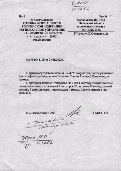 5. Приложение 2 «Ответ ФСБ Читинской области от 7.06.2002»