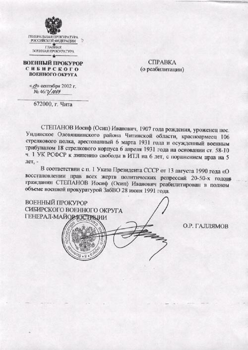 6. Приложение 3 «Справка о реабилитации Степанова Иосифа Ивановича»