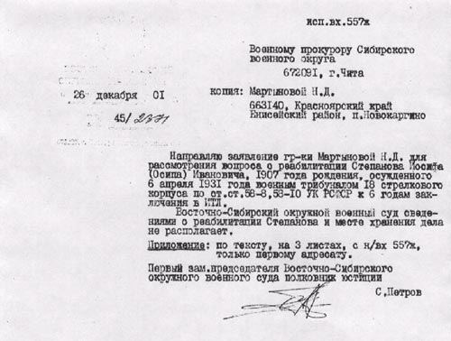 Как и все граждане страны, мой прадед, Степанов И.И. был призван в армию, стал красноармейцем 106 стрелкового полка. Но даже и там его достала карающая рука родного государства. 6 марта 1931 г. он был арестован, а 6 апреля военный трибунал 18 стрелкового корпуса приговорил: на основании ст. 58-10 (антисоветская пропаганда и агитация) и 58-8 ч.1 (совершение террористических актов, направленных против советской власти) УК РСФСР к лишению свободы в ИТЛ на 6 лет с поражением прав на 5 лет. (Прил.4).