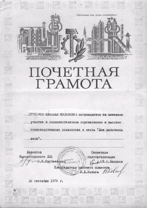 П. Зырянка был основан раскулаченными крестьянами из Забайкалья, здесь был создан лесопункт. И впоследствии, он стал местом проживания самых разных народов, по воле государства, оказавшихся в ссылке. Здесь проживали: литовцы, эстонцы, немцы, азербайджанцы, украинцы. Одним из них был Ф. Лымарь. Его до сих пор вспоминают старожилы, как хорошего печника. Жили, друг другу помогали, платили налоги, но однажды его жена сломала ногу и чтобы помочь по хозяйству, попросил он приехать из Украины племянницу Гармаш Екатерину. Вот здесь то и встретились они с моим дедом (Прил.14). Она – молодая красивая украинка и он – высокий, статный, уже сибиряк, потому что родился в Сибири. Вскоре они поженились (Прил.12). Дед, Степанов Николай Иосифович всю жизнь работал на тракторе, считался хорошим специалистом, был награжден почетными грамотами, ценными подарками, его портрет висел на доске Почета Енисейского леспромхоза. Имеет звания «Ударник Коммунистического труда» и «Ветеран труда» (Прил.5,6). Бабушка, Екатерина Федоровна работала разнорабочей. Вырастили двоих детей: сына Владимира и дочь Ольгу.