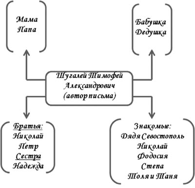 Читая письмо, я ещё не знала, кому именно принадлежало оно. У меня было несколько «зацепок» – имена, упомянутые в письме и имя человека - автора данного письма. Чтобы как-то разобраться чьё письмо я решила составить схему. (см. приложение №1)
