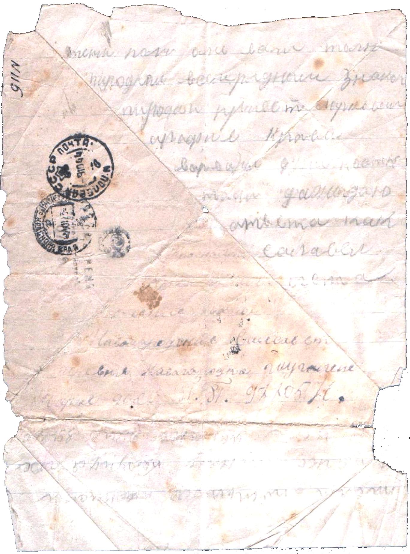 На письме стоит штамп Марые гос. П.П. 92205 Н. от 9.10.44, имеется и штамп получения 27.10.44.