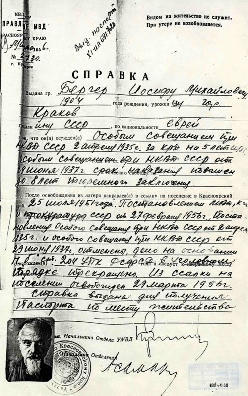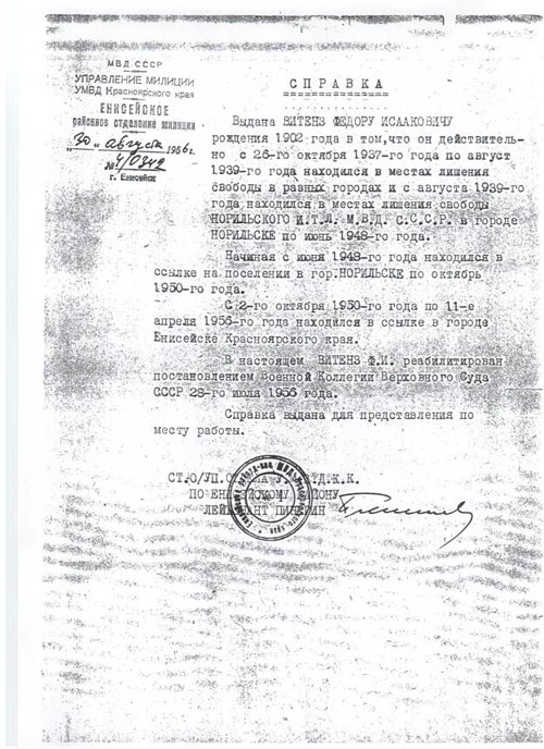 4. Репрессивная политика в судьбе евреев-норильлаговцев Бергера И.И., Витенза
