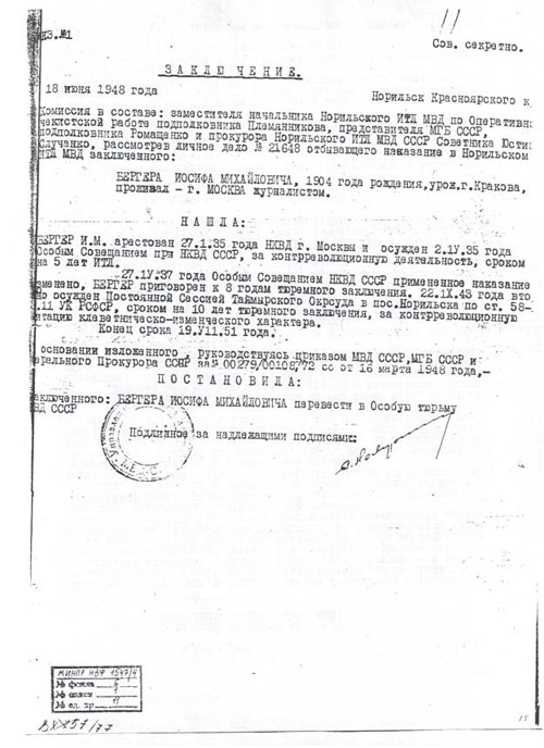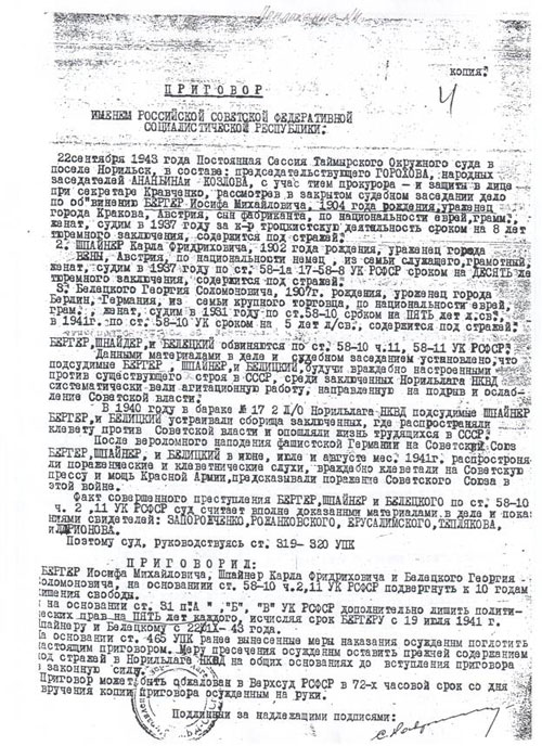Бергер Иосиф Михайлович, 1904 года рождения, уроженец города Кракова, сын фабриканта, по национальности еврей, грамотный, женат, судим в 1937 году за контрреволюционную троцкистскую деятельность сроком на 8 лет тюремного заключения. А в 1943 году осужден постоянной Сессией Таймырского Окрсуда в пос. Норильск по ст. 58-11 УК РСФСР сроком на 10 лет тюремного заключения за контрреволюционную агитацию клеветническо-изменческого характера. В приговоре говорилось, что подсудимые Бергер, Шпайнер и Белицкий, будучи враждебно настроенными против существующего строя в СССР, среди заключенных Норильлага НКВД систематически вели агитационную работу, направленную на подрыв и ослабление Советской власти. Устраивали сборища заключенных, где распространяли клевету против советской власти и опошляли жизнь трудящихся в СССР. После вероломного нападения фашистской Германии на Советский Союз Бергер, Шпайдер и Белицкий в июне, июле и августе 1941 года распространяли пораженческие и клеветнические слухи, враждебно клеветали на Советскую прессу и мощь Красной Армии, предсказывали поражение Советского Союза в этой войне [6] (Приложение 4).