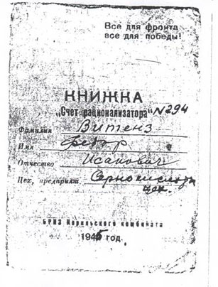 Репрессивная машина коснулась и Витенза Федора Исааковича, 1902 года рождения. С 1939 по 1948 год он находился в местах лишения свободы Норильского ИТЛ МВД СССР. В 1945 году, будучи инженером сернокислотного цеха Витенз Ф.И. в целях улучшения регулирования технологического процесса и увеличения степени абсорбции предложил изменить систему питания циркуляционных бачков и систему отбора технологических проб серной кислоты. Это дало улучшение абсорбции минимум на 0,5 процентов и условной экономии 11135 руб. в год. За внедрение рационализаторского предложения ему была объявлена благодарность и премия в сумме 75 рублей [7] (Приложение 5).