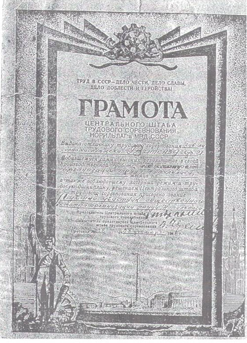 Технорук сернокислотной установки Г.Калюский был премирован месячным окладом. В мае сорок пятого его, вчерашнего заключенного, лишенного на пять лет паспорта, прописки и избирательных прав, вчерашнего «шпиона» и «врага народа», наградили орденом «Знак Почета»! Спустя еще две недели пришли наградные документы на медаль – «За доблестный и самоотверженный труд в тылу». Григорий Соломонович Калюский прожил в Норильске еще 14 лет после войны. Вызвал с «материка» жену с двумя сыновьями. Получил реабилитацию. Успешно руководил сернокислотным цехом (в личном деле целый ворох благодарностей и выписок за внедрение рацпредложений, званий «лучший новатор», «лучший руководитель» и т.д.). При нем сернокислотный поменял прописку (новый корпус построили на медном в середине пятидесятых) и «начинку» (кислоту стали получать из обжига медного концентрата).